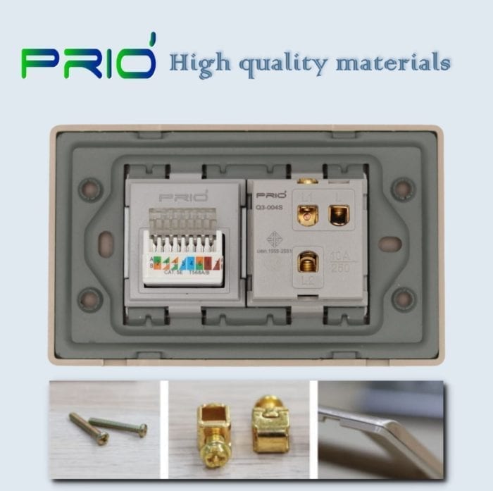 PRIO อุปกรณ์สวิทช์ ปลั๊กไฟบ้าน สวิทช์ usb ยี่ห้อ พรีโอ่ รองรับกระแสไฟฟ้า AC 110 ~ 250V , USB 5V 2000mA 1 gang 1 way switch with neon + 1 gang LAN RJ45 socket คุณสมบัติ: