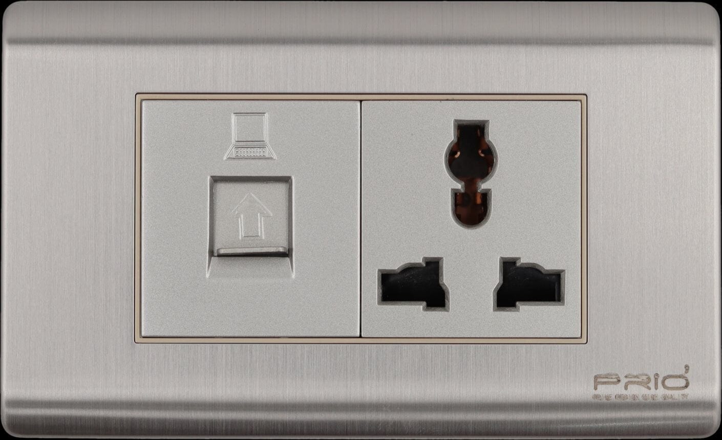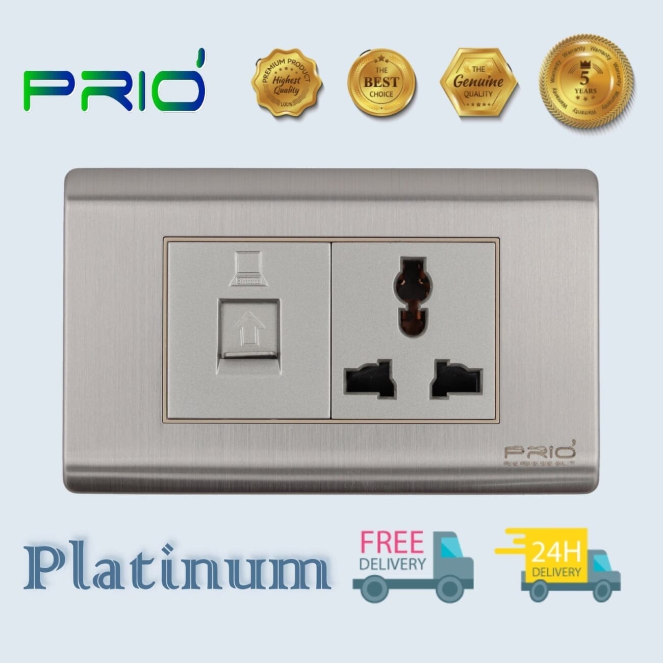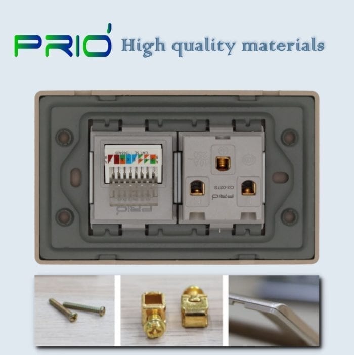 PRIO อุปกรณ์สวิทช์ ปลั๊กไฟบ้าน สวิทช์ usb ยี่ห้อ พรีโอ่ รองรับกระแสไฟฟ้า AC 110 ~ 250V , USB 5V 2000mA 1 gang RJ11 Telephone socket + 1 gang LAN RJ45 socket คุณสมบัติ: