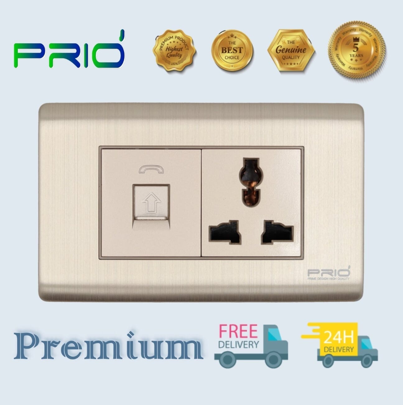 PRIO อุปกรณ์สวิทช์ ปลั๊กไฟบ้าน สวิทช์ usb ยี่ห้อ พรีโอ่ รองรับกระแสไฟฟ้า AC 110 ~ 250V , USB 5V 2000mA 1 gang 2 way switch with neon + 1 gang RJ11 Telephone socket คุณสมบัติ:
