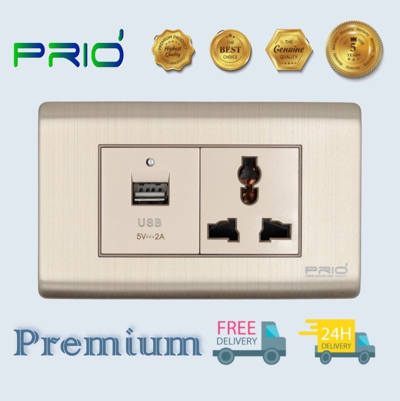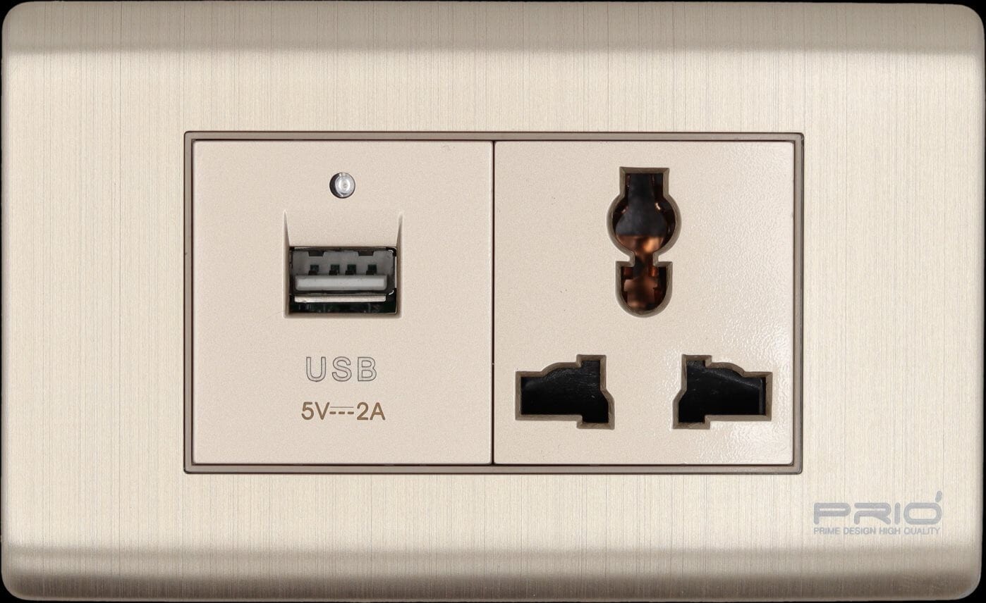 PRIO อุปกรณ์สวิทช์ ปลั๊กไฟบ้าน สวิทช์ usb ยี่ห้อ พรีโอ่ รองรับกระแสไฟฟ้า AC 110 ~ 250V , USB 5V 2000mA